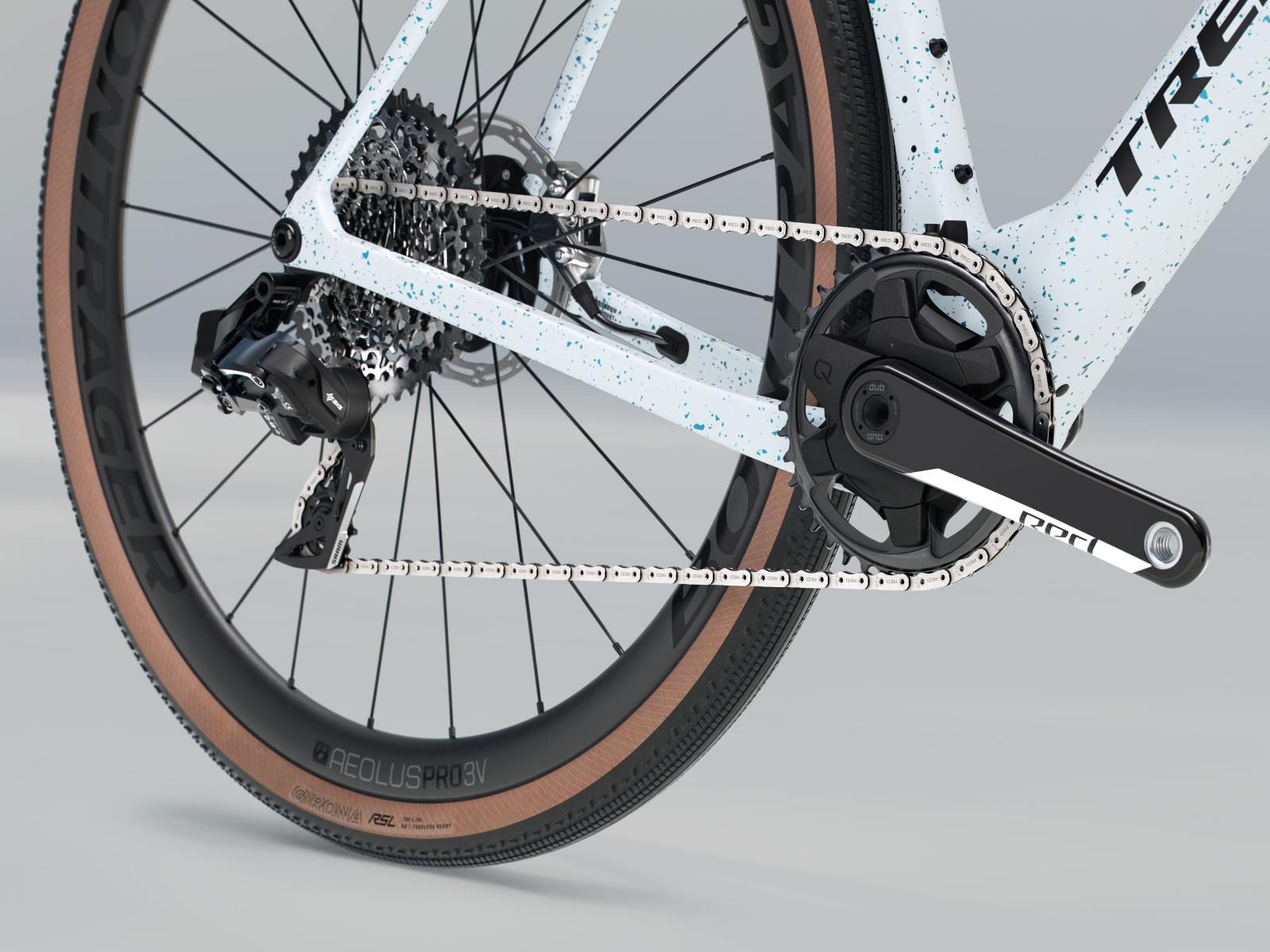 Einen leichten und aerodynamischen Rahmen aus 800 Series OCLV Carbon mit IsoSpeed-Komforttechnologie und vielen Befestigungspunkten für die wichtigsten Utensilien des Renntages. Bontrager Aeolus Pro 3V Carbonlaufräder und eine Trek Aero RSL Lenker-Vorbau-Einheit aus Carbon für ein leichtgewichtiges und agiles Fahrverhalten. Außerdem bekommst du eine drahtlose, für holprigere Bedingungen entwickelte SRAM RED XPLR AXS 1x12-Schaltung der vorherigen Generation.