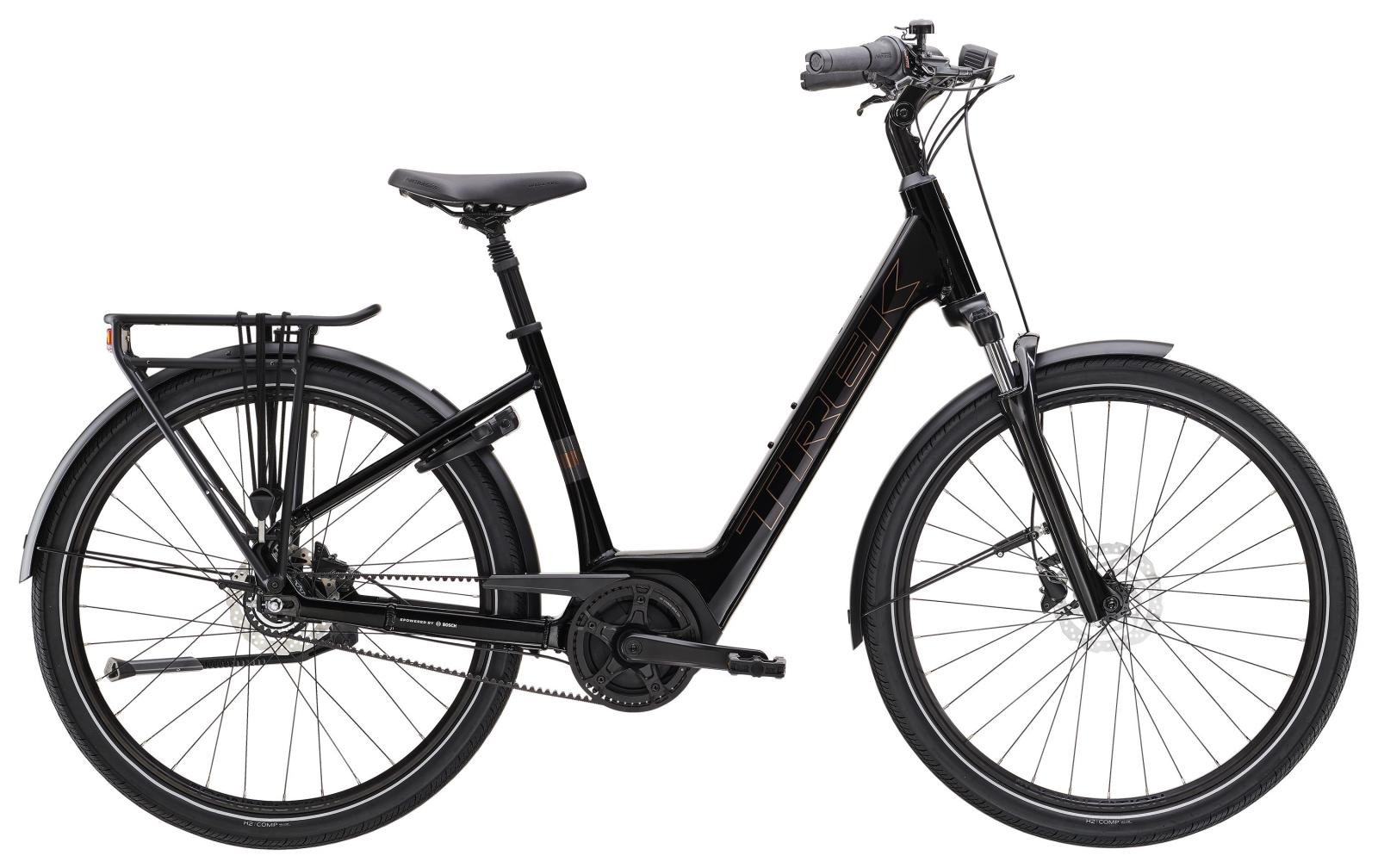 Einen schlanken Rahmen aus Alpha Smooth Aluminium mit Lowstep-Geometrie und interner Zug-/Leitungsführung, einen Active Line Plus Motor von Bosch mit 250 W Leistung und 50 Nm Drehmoment zur Antriebsunterstützung bis 25 km/h, einen 400 Wh starken CompactTube Akku und einen Purion 200 Controller. Dazu gibt es einen verlässlichen und wartungsarmen Gates CDX Riemenantrieb, eine gefederte Sattelstütze, eine Federgabel, hydraulische Scheibenbremsen, ein Rücklicht, einen MIK HD Heckgepäckträger samt SIDE Adapter, Schutzbleche, ergonomische Griff und einen äußerst komfortablen Bontrager Boulevard Sattel.
