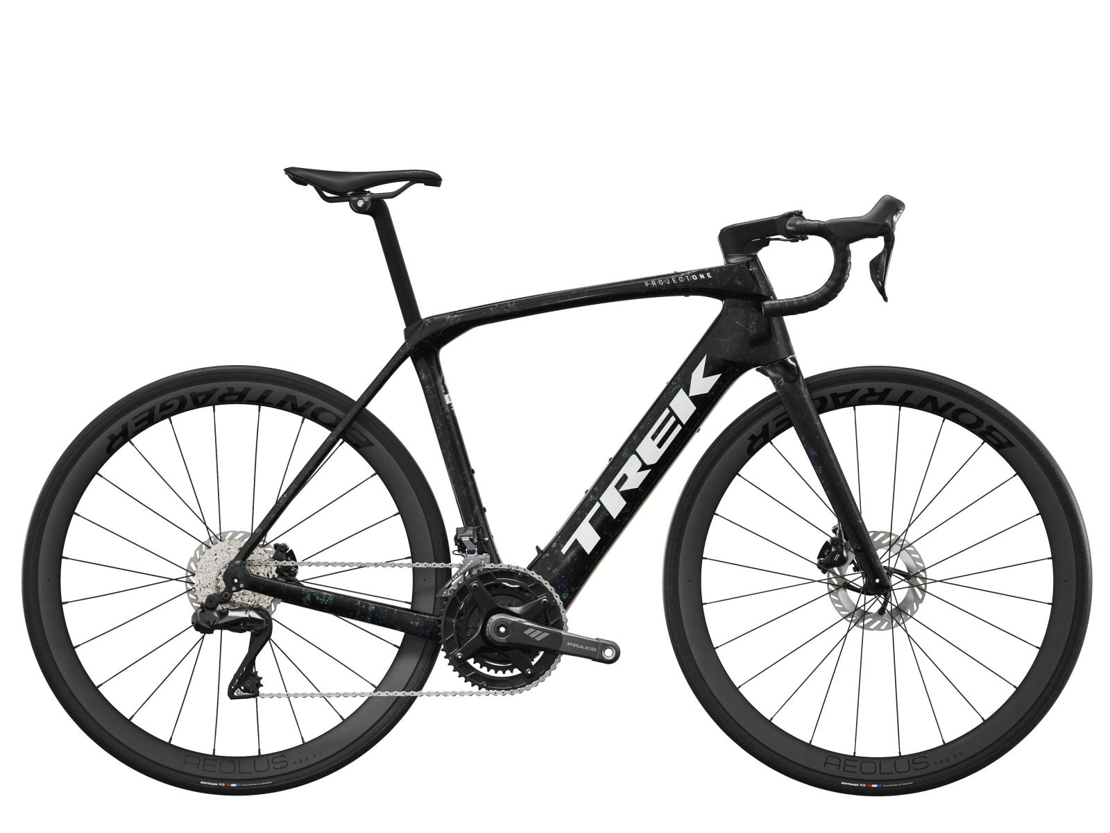 Einen äußerst leichten Rahmen aus 800 Series OCLV Carbon mit hinterem IsoSpeed. Einen kraftvollen Harmonic Pinring-Motor von TQ mit einem Drehmoment von 50 Nm, der dich bis zu einer Geschwindigkeit von 25 km/h unterstützt, einen 360 Wh großen integrierten Akku, ein in den Rahmen integriertes, smartes LED-Display und diskret in die Bremsgriffgummis verbaute Bedienelemente für das Umschalten der Unterstützungsmodi. Aeolus Pro 37-Laufräder aus OCLV Carbon, eine drahtlose, elektronische Shimano Ultegra Di2 2x12-Schaltung, eine Carbonkurbelgarnitur, ein vibrationsdämpfender Bontrager Pro IsoCore-Lenker und ein RCS Pro-Vorbau mit voll