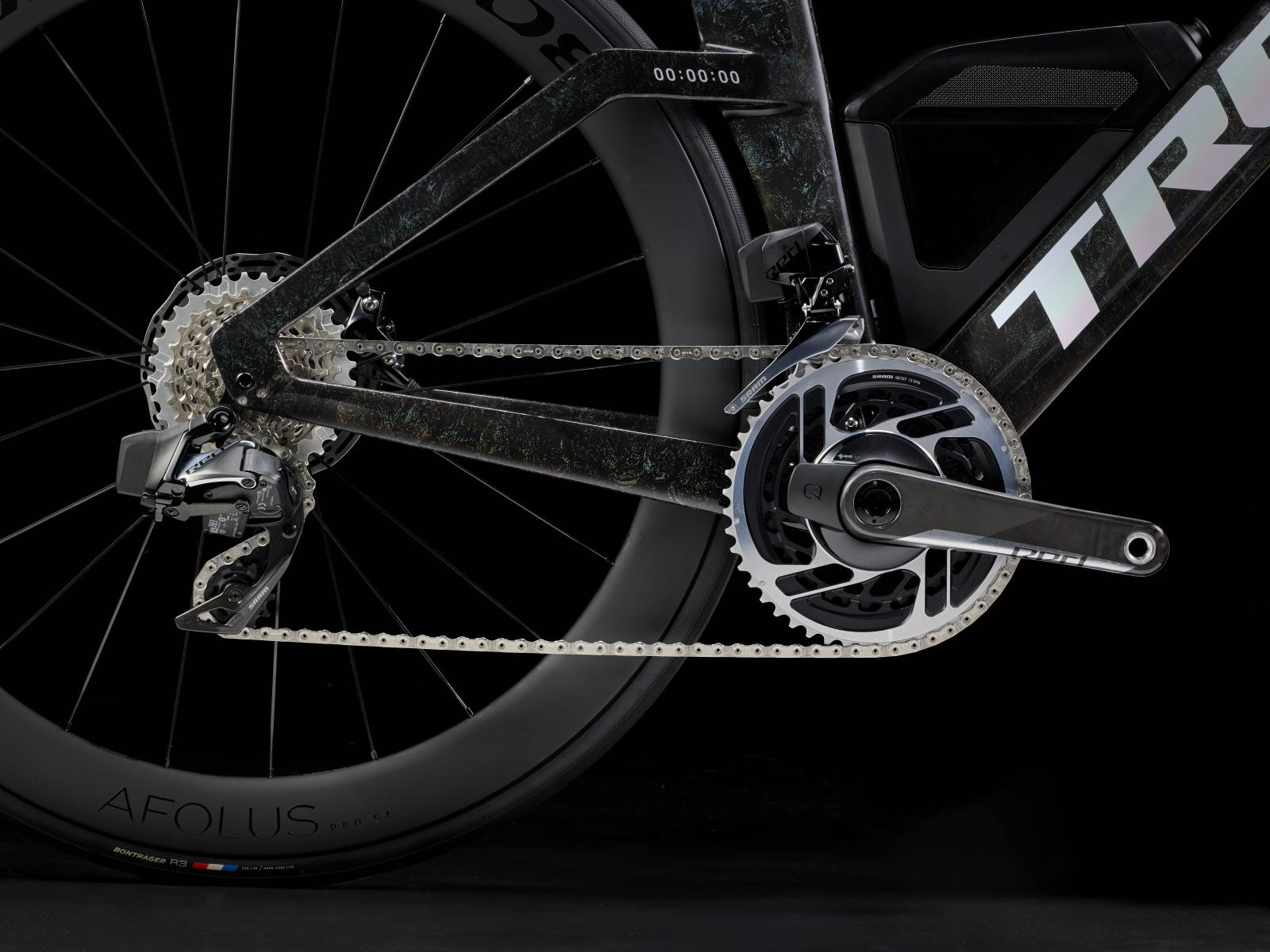 Einen ultraleichten Rahmen aus 800 Series OCLV Carbon, windschnittige Rohre mit Kammtail Virtual Foil Profil (KVF), eine Speed Concept Carbongabel mit aerodynamischem Profil, straßenglättendes IsoSpeed, integrierte Aufbewahrungslösungen für Verpflegung, Flüssigkeitsversorgung und Pannenkit, einen drahtlosen, elektronischen SRAM RED AXS 12fach-Antrieb der vorherigen Generation mit SRAM AXS Blips Schalthebeln, ein SRAM RED AXS Powermeter, eine integrierte Lenker/Vorbau-Einheit, einen triathlonspezifischen Bontrager Hilo Pro Carbonsattel, zuverlässige Scheibenbremsen und aerodynamische Bontrager Aeolus Pro 51 Laufräder aus OCLV Car