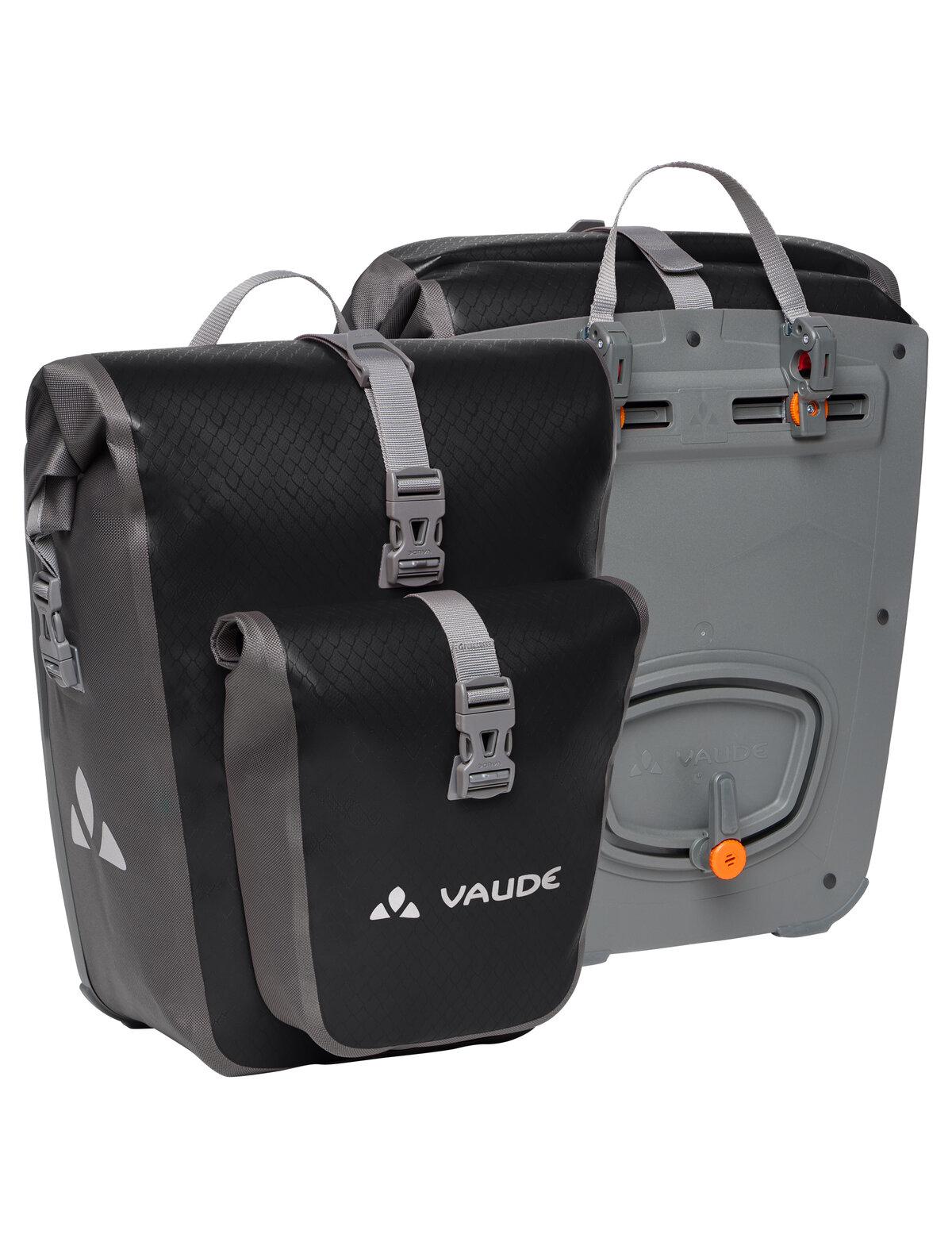 Auf in die große, weite Welt! Die wasserdichten Hinterradtaschen werden aus robustem, PVC-freiem Planenmaterial am deutschen VAUDE-Standort in der Nähe des Bodensees hergestellt und würden gerne mit Dir auf große Reisen gehen. Sie lassen sich durch den Wickelverschluss auf individuelle Größen bringen und absolut dicht verschließen. Für Übersichtlichkeit sorgen eine einfache Innentasche sowie die aufgeschweißte Außentasche. Die Radtaschen werden mit dem QMR 2.0-System und stabiler Rückenplatte rechts und links am hinteren Gepäckträger befestigt, sind über einfach bedienbare Handrädchen justierbar und lassen sich schnell und einfach abnehmen. Mit einem Fahrradschloss können sie direkt am QMR-Haken verriegelt werden. Mit reflektierenden Elementen. Lieferumfang: zwei Taschen (Paar). Das Gesamtvolumen beider Taschen beträgt 51 Liter. Kann durch diese praktische Zubehör-Taschen ergänzt werden: Toolbag Back, Sortyour Back, Addita Bag.