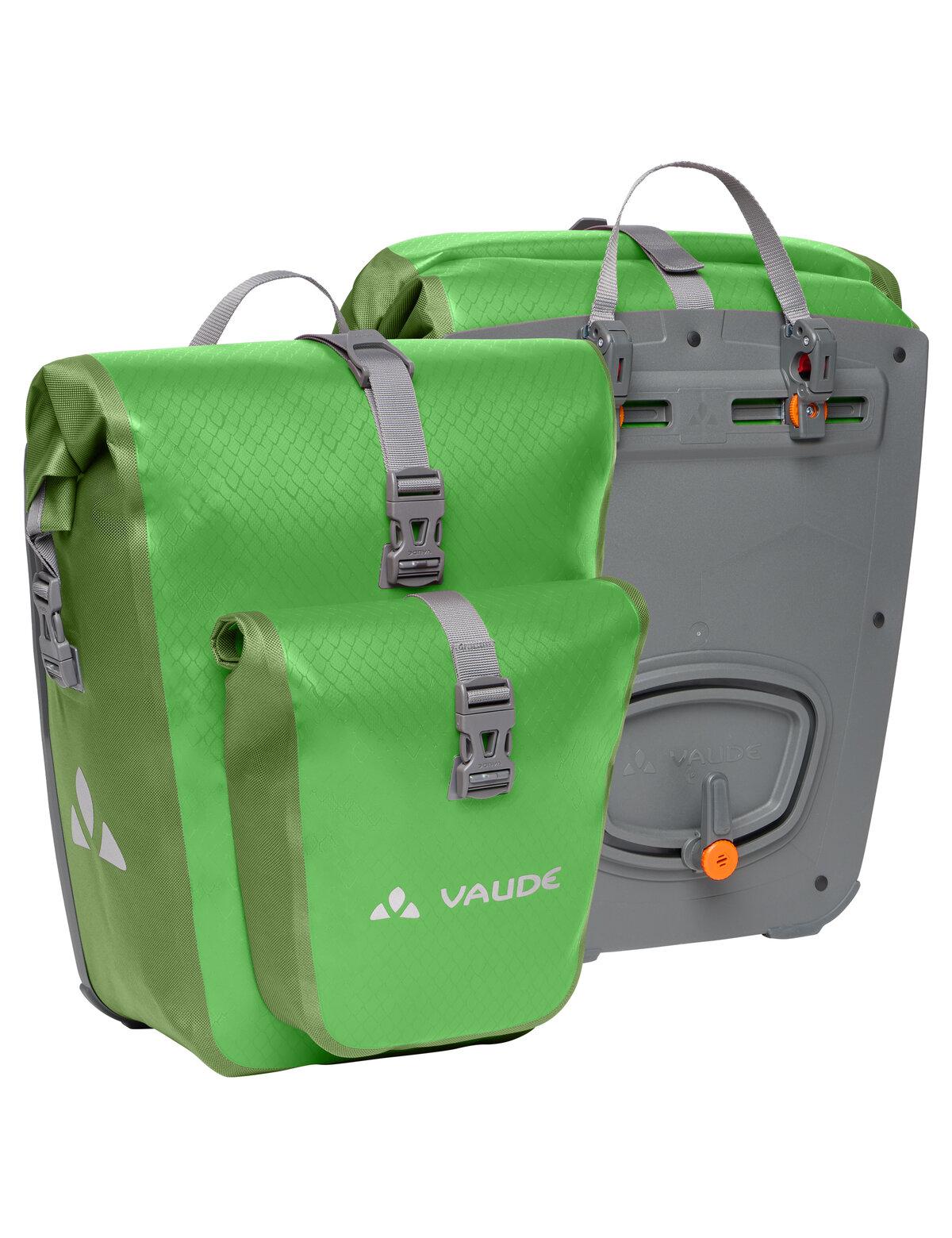 Auf in die große, weite Welt! Die wasserdichten Hinterradtaschen werden aus robustem, PVC-freiem Planenmaterial am deutschen VAUDE-Standort in der Nähe des Bodensees hergestellt und würden gerne mit Dir auf große Reisen gehen. Sie lassen sich durch den Wickelverschluss auf individuelle Größen bringen und absolut dicht verschließen. Für Übersichtlichkeit sorgen eine einfache Innentasche sowie die aufgeschweißte Außentasche. Die Radtaschen werden mit dem QMR 2.0-System und stabiler Rückenplatte rechts und links am hinteren Gepäckträger befestigt, sind über einfach bedienbare Handrädchen justierbar und lassen sich schnell und einfach abnehmen. Mit einem Fahrradschloss können sie direkt am QMR-Haken verriegelt werden. Mit reflektierenden Elementen. Lieferumfang: zwei Taschen (Paar). Das Gesamtvolumen beider Taschen beträgt 51 Liter. Kann durch diese praktische Zubehör-Taschen ergänzt werden: Toolbag Back, Sortyour Back, Addita Bag.